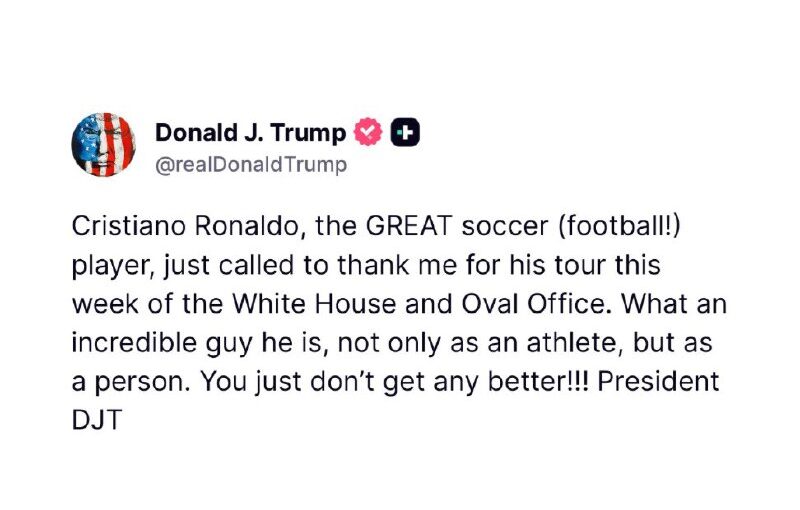 اکنون، طبق پستی که از حساب کاربری دونالد ترامپ، رییس‌جمهور ایالت متحده آمریکا در شبکه‌های اجتماعی منتشر شده، او نوشته است: «کریستیانو رونالدو، بازیکن بزرگ فوتبال (فوتبال!) همین الان با من تماس گرفت تا از من به خاطر بازدید این هفته‌اش از کاخ سفید و دفتر بیضی‌شکل تشکر کند. او چه مرد فوق‌العاده‌ای است، نه تنها به عنوان یک ورزشکار، بلکه به عنوان یک شخص. شما بهتر از این نمی‌شوید!»